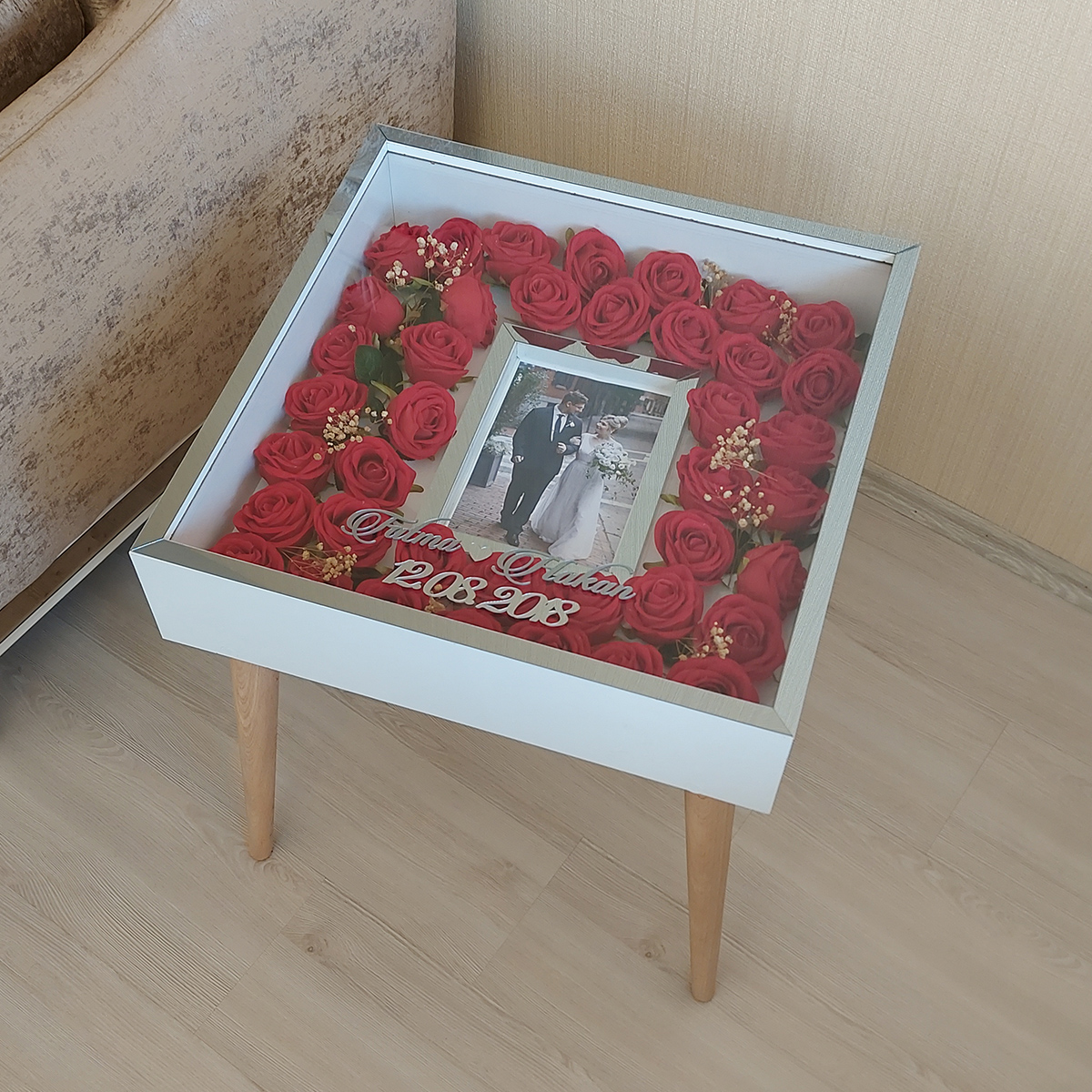 Beyaz-Füme Fotoğraf Bölümlü Isimli Anı Sehpası! Özel Gün Çiçekleriniz Için Yan Sehpa! Gül Sehpası!